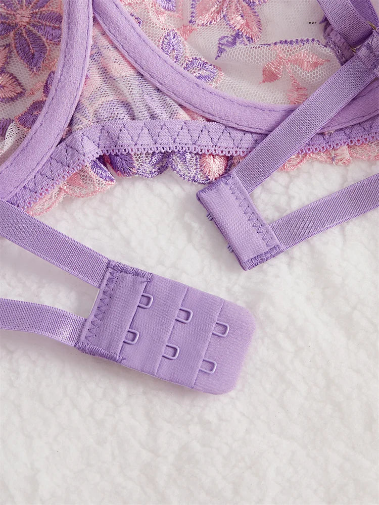 Indulge in the allure of the Enchanted Desire Floral Lingerie Set, designed for the woman who craves both elegance and seduction. This luxurious set features delicate floral embroidery on sheer tulle fabric, creating a beautifully transparent look. The push-up bra and sexy panties enhance your natural curves, while the rich purple hue adds a touch of sophistication. Perfect for a night of passion or a special occasion, this set embodies erotic charm and sensual luxury.