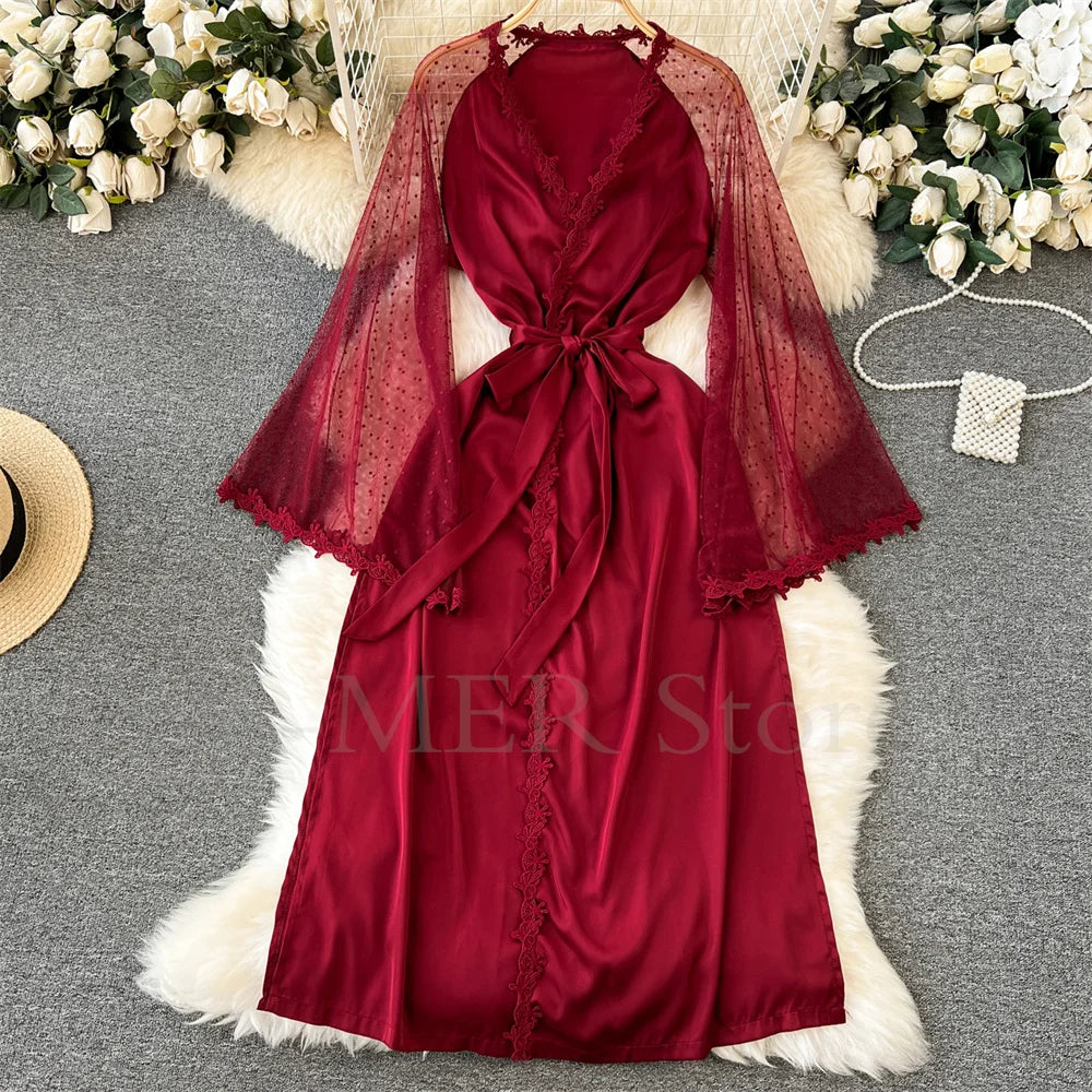 The Midnight Empress Satin Robe is a seductive blend of elegance and luxury. Crafted from smooth satin, it glides effortlessly over your skin, offering both comfort and allure. The embroidered edges and delicate mesh sleeves add a touch of femininity to its flowing design.
